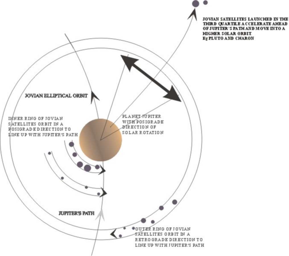 | However, it is plausible that Jupiter continued to launch satellites as the ejectile plume moved from the second quadrant and into the third quadrant. Objects launched at this stage move ahead of Jupiter and follow a higher lunar obit. Small rocky objects like Pluto and Charon are candidates for this mode of solar orbit launch. | |