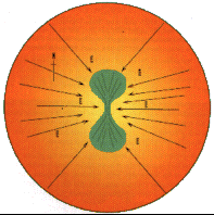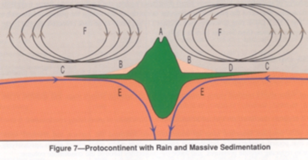 Circa -3500my, radial compressive forces, created by globally circulating magma (E), built up thick highly folded, greenstone, rocks. A dumbbell shaped Proto continent resulted from stronger equatorial magma currents. (See Fig-Proto Continent.)