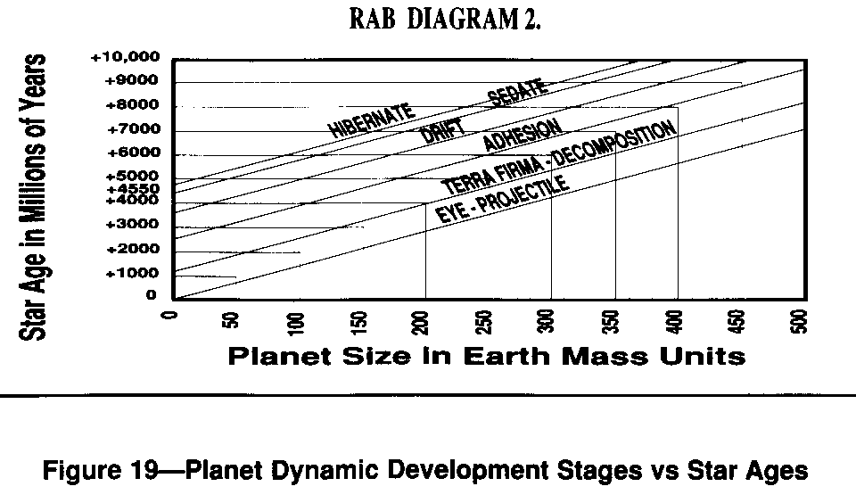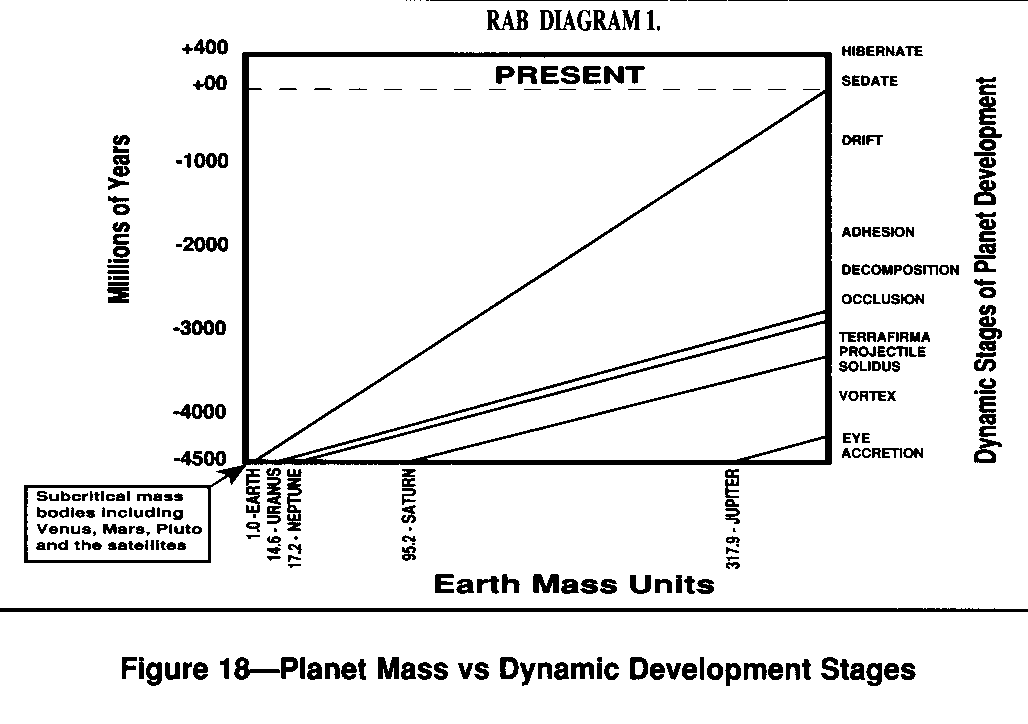 Previous planet stages are shown in Time vs Activity RAB Diagram 1, that incorporates the major Dynamic Geological Time Scale elements. RAB Diagram 1 shows the evolutionary cycle for planets of Super Critical Mass (see P,S,&L Section 6. Critical Mass). Because planets cool at different rates, we can compare previous stages of dynamic development on Earth (see Dynamic Geological Time Scale) with conditions existing at the larger planets today.