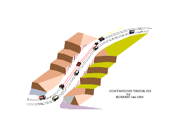 ramp. Trucks attach to the rope by hydraulic clamps. The rope passes